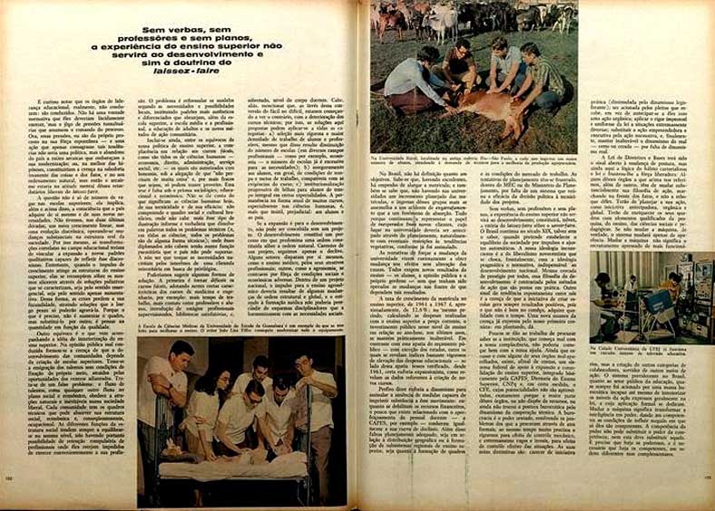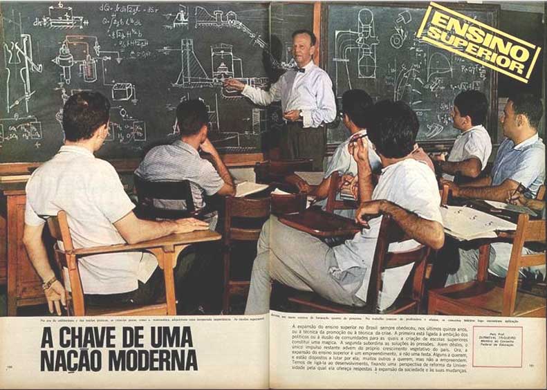 A expansão do Ensino Superior no Brasil sempre obedeceu, nos últimos quinze anos, ou à técnica da promoção ou à técnica da crise. A primeira está ligada à ambição dos políticos ou à ilusão de comunidades para as quais a criação de escolas superiores constitui uma mágica. A segunda subordina as soluções às pressões. Além destes, o único impulso restante advém do próprio crescimento vegetativo do País. Ora, a expansão do Ensino Superior é um empreendimento, e não uma festa. Alguns a querem, e estão dispostos a lutar por ela; muitos outros a querem, mas não a empreendem. Temos de ligá-la ao desenvolvimento, fixando uma perspectiva de reforma da Universidade pela qual ela ofereça respostas à expansão da sociedade e às suas mudanças. [...] (MANCHETE N° 865, 16.11.1968)