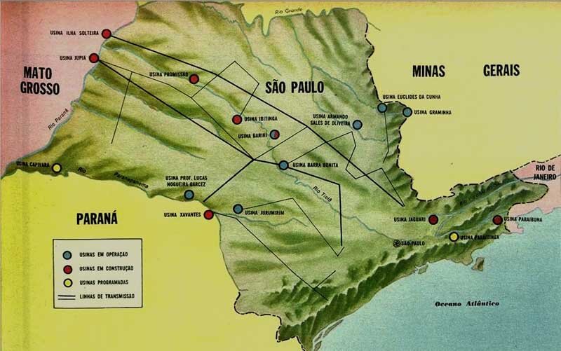 Casa de máquinas da Usina Euclides da Cunha, no Rio Pardo, que produz 94,8 kW e é uma das mais antigas do Estado. Jaguari, no Rio Paraná, completa o sistema de produção de energia e regularização das enchentes. As barragens do Jaguari e Paraibuna-Paraitinga reterão os excessos de água nos períodos das chuvas, para distribuí-los doseadamente no decorrer das estiagens, de maneira a manter constante o volume de água do Paraíba, desde São Paulo até a foz, no Estado do Rio de Janeiro. Esse recurso possibilitará a realização de um sonho paulista: a construção da Usina de Caraguatatuba. No Rio Pardo, as usinas abastecem principalmente partes das regiões Norte e Nordeste do Estado de São Paulo e Sul de Minas Gerais. Na Usina Limoeiro funciona há anos uma estação de piscicultura. O cérebro eletrônico controla de Botucatu a carga de eletricidade, os níveis de água e o movimento das comportas.