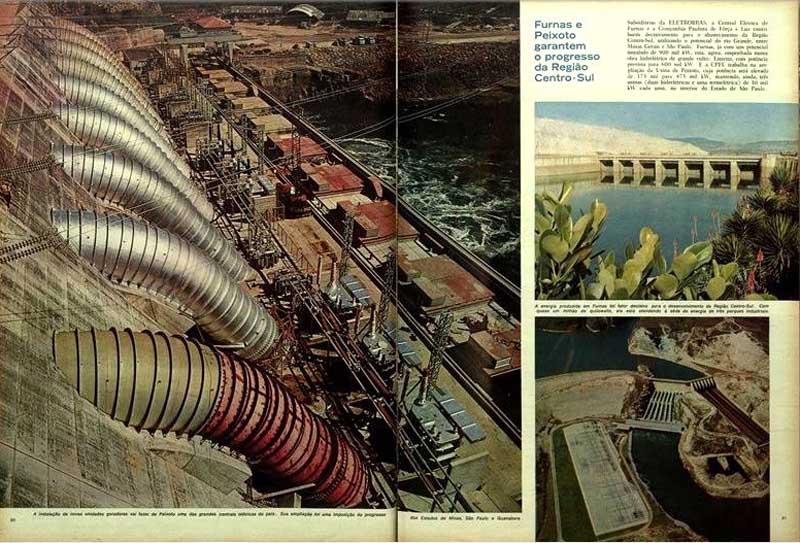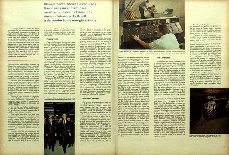A meta básica para o próximo triênio é um aumento de três milhões de kW na potência instalada. Para isto, milhares de engenheiros, operários e técnicos trabalham dia e noite, levantando grandes barragens e instalando casas-de-força que garantirão a energia de que o País necessita. Estreito, no Rio Grande, e Funil, na Paraíba, são itens importantes do programa que está sendo rigorosamente cumprido. A primeira, da Central Elétrica de Furnas, subsidiária da ELETROBRAS, vai trazer um reforço de 600 mil kW à potência instalada; a segunda, da mesma empresa, dará ao sistema da Região Centro-sul mais 210 mil kW. Estes dados mostram que o setor energético saiu da estagnação em que se encontrava há vários anos e, recuperado, caminha para sua plena integração. Um planejamento global efetivo assegura solução a um dos mais sérios e prementes problemas da economia brasileira: o da energia elétrica.