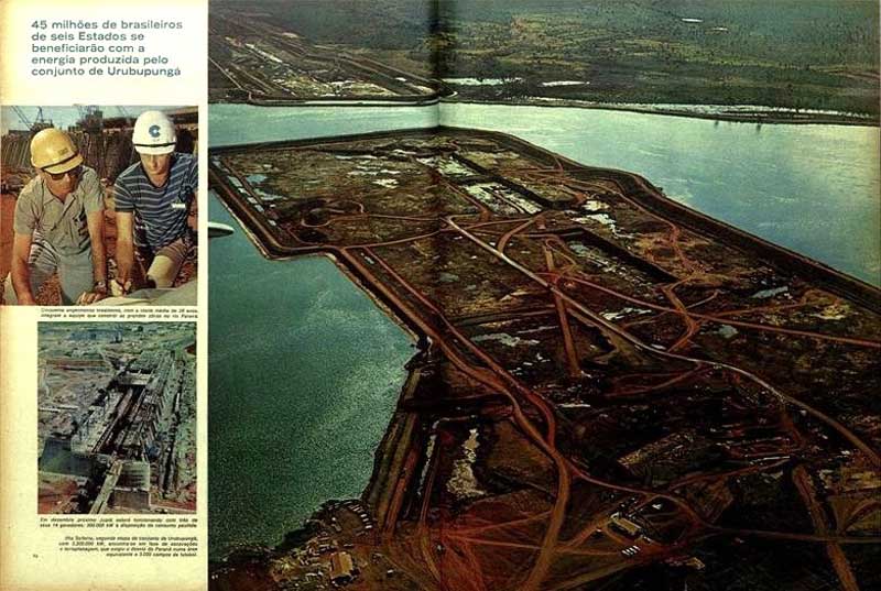 ILHA SOLTEIRA, a maior de todas, coloca-se entre as maiores do mundo. Gerará, na 1ª etapa, 1.760.000 kW com onze unidades e, no final, atingirá a 3.200.000 kW. Ilha Solteira e Jupiá forman o chamado “conjunto de Urubupungá” que, depois de terminado, só será sobrepujado em produção à Usina de Bratsk, na União Soviética, com potência de 5.000.000 kW. Para se ter uma ideia mais clara de suas dimensões basta citar que a energia a ser produzida pela Ilha Solteira poderá abastecer 70 cidades como Porto Alegre; o volume de terraplenagem corresponde ao do Pão de Açúcar; o consumo mensal de concreto daria para construir 15 edifícios iguais ao Banco do Estado de São Paulo: o volume de água a ser represado equivale a 6 vezes ao da Baía da Guanabara. A construção do conjunto do Urubupungá foi confiada a uma firma brasileira, a Construções e Comércio Camargo Corrêa S.A. que deu prova vibrante da capacidade empresarial nacional, realizando obras que a colocam ao lado do que há de mais avançado no mundo em matéria de grandes construções.