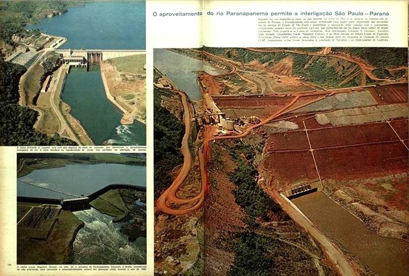 As instalações da subestação elevadora de Ibitinga estão em fase adiantada de conclusão. Pelas ultramodernas torres de transmissão do “linhão” será transmitida a energia que vai alimentar a Grande São Paulo, que devora 40% do consumo nacional. Cinquenta engenheiros brasileiros, com a idade média de 28 anos, integram a equipe que constrói as grandes obras no Rio Paraná. Em dezembro próximo, Jupiá estará funcionando com 3 de seus 14 geradores: 300.000 kW à disposição do consumo paulista. Ilha Solteira, segunda etapa do conjunto de Urubupungá, com 3.200.000 kW, encontra-se em fase de escavações e terraplanagem, que exigiu o desvio do Paraná numa área equivalente a 3.000 campos de futebol. Barra Bonita ocupando posição central na geografia do Estado de S. Paulo contribui destacadamente para o desenvolvimento regional. Já está instalado o canteiro de obras de Promissão, que será a maior usina do sistema do Rio Tietê. As instalações da subestação elevadora de Ibitinga estão em fase adiantada de conclusão. Pelas ultramodernas torres de transmissão do “linhão” será transmitida a energia que vai alimentar a Grande São Paulo, que devora 40% do consumo nacional. Cinquenta engenheiros brasileiros, com a idade média de 28 anos, integram a equipe que constrói as grandes obras no Rio Paraná. Em dezembro próximo, Jupiá estará funcionando com 3 de seus 14 geradores: 300.000 kW à disposição do consumo paulista. Ilha Solteira, segunda etapa do conjunto de Urubupungá, com 3.200.000 kW, encontra-se em fase de escavações e terraplanagem, que exigiu o desvio do Paraná numa área equivalente a 3.000 campos de futebol. Barra Bonita ocupando posição central na geografia do Estado de S. Paulo contribui destacadamente para o desenvolvimento regional. Já está instalado o canteiro de obras de Promissão, que será a maior usina do sistema do Rio Tietê.