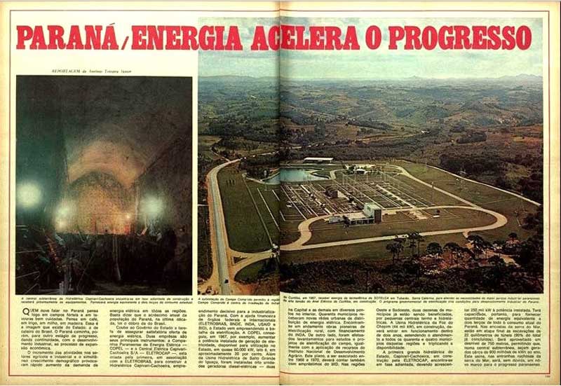 Este plano, a ser executado entre 1968 e 1970, deverá contar também com empréstimos do BID. Nas regiões Oeste e Sudoeste, duas dezenas de municípios já estão sendo beneficiados, por pequenas centrais termo e hidrelétricas. A Usina Hidrelétrica da Foz do Chopim (44 mil kW), em construção, deverá entrar em funcionamento dentro de dois anos, estendendo o atendimento a todos os quarenta e quatro municípios daquelas regiões e triplicando a disponibilidade. A primeira grande hidrelétrica do Estado, Capivari-Cachoeira, em construção pela ELETROCAP, encontra-se em fase adiantada, devendo acrescentar 250 mil kW à potência instalada. Terá capacidade, portanto, para fornecer quantidade de energia equivalente a dois terços de todo o consumo atual do Paraná. Nas encostas da serra do Mar, estão em etapa final as escavações de 22 quilômetros de túneis (90% do total já concluídos). Será aproveitado um desnível de 750 metros, permitindo que, numa central subterrânea, sejam gerados cerca de 900 milhões de kWh ao ano. Esta usina, nas entranhas rochosas da serra do Mar, será, sem dúvida, um novo marco para o progresso paranaense.
