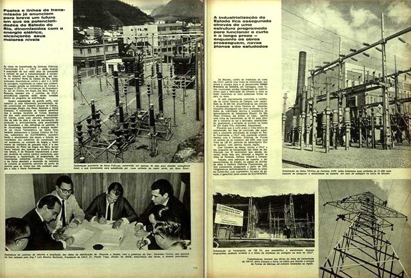 Prevendo que a curto prazo a linha tronco de transmissão, em fase de conclusão, não suportará a crescente solicitação de energia do Norte Fluminense, a CELF vem mantendo entendimentos com a Centrais Elétricas de Furnas no sentido de se construir, até 1970, uma nova linha de 138 kV, partindo de Adrianópolis (Nova Iguaçu), com destino àquela região. Com Casimiro de Abreu, iniciou a CELF o seu programa de recuperação das redes de distribuição nos 32 municípios que atende, devendo, ainda este ano, reformar e ampliar as redes de Resende, Itatiaia, Imbariê e Campos. Traçada essa estrutura de suporte, o desenvolvimento do Estado, no campo de atividade afeto à Centrais Elétricas Fluminenses, estará plenamente assegurado a partir de 1970, integrando-se definitivamente o Estado no sistema Centro-Sul, cujo suprimento, no setor de geração, é garantido pelas usinas da ELETROBRÁS. (MANCHETE N° 845)