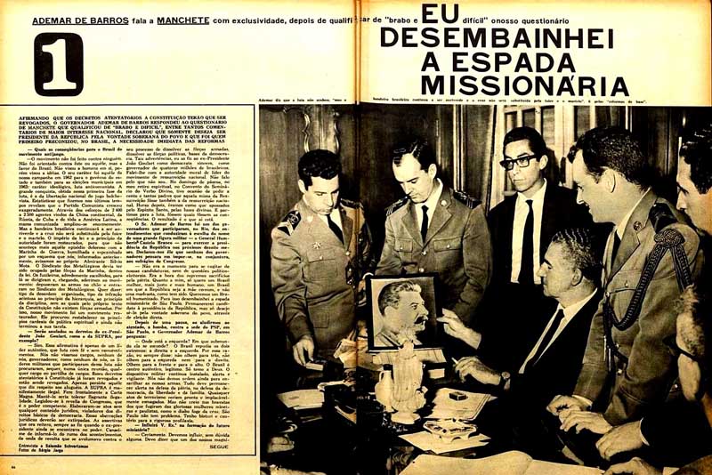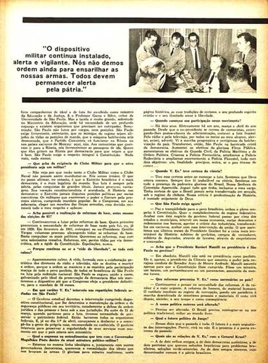 Manchete: Candidato mais do que nunca à Presidência da República, nas eleições de 1965 e cada vez mais convicto de sua vitória, acha que lhe cabe, no processo histórico brasileiro, não só ser o Presidente das reformas como ainda conceituá-las através de sua própria implantação, livrando-as dos equívocos e contrafações. Recusa-se a dar um cunho reformista ao governo do Sr. João Goulart, em sua opinião possuidor de todos os defeitos de um pendor caudilhesco e de todos os vícios de uma formação totalitária, o que explicaria a sua inesperada queda, como que no vácuo, diante da paralisação e estarrecimento das minorias passionais que o apoiavam. Enquanto fala, o Sr. Carlos Lacerda vai até a varanda. Escuridão e nevoeiro envolvem o Mar e Montanhas. Na praia do Flamengo, brilha, ao longo uma luz pequenina. Fiel a uma imagem obsessiva, o Governador da Guanabara olha-a por alguns instantes, aponta-a e me diz: