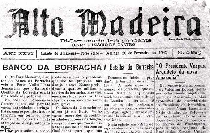 Nos anos 1940, o entusiasmo era grande. Afinal, vivia-se o Ciclo da Borracha nos confins amazonenses, acreanos e mato-grossenses. Segundo o jornal Alto Madeira, então dirigido por Inácio de Castro em sua edição de 26/2/1943, a mobilização econômica da borracha "é um dos grandes acordos assinados em Washington, DC (EUA), entre os governos brasileiro e norte-americano.