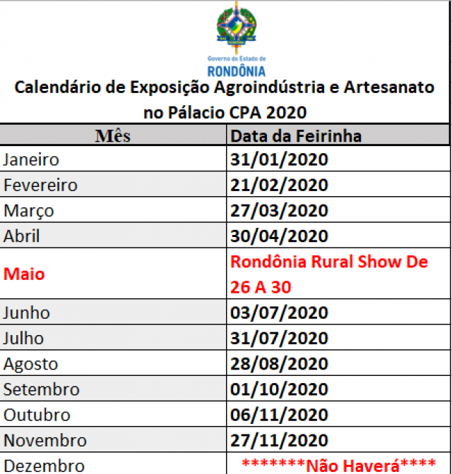 Para dar maior visibilidade e movimentar a economia da agricultura familiar, o governo de Rondônia, por meio da Secretaria de Estado da Agricultura (Seagri), montou o calendário 2020 de Exposição da Agroindústria e Artesanato no Palácio Rio Madeira, em Porto Velho. Veja o tabela ao lado.