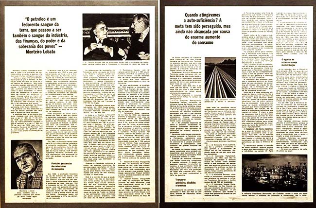 A performance da Petrobras, que dobrou sua produção em quatro anos, e atingiu 209 mil barris diários, é o resultado de um enorme esforço dos operários e técnicos brasileiros. Índices de outros Países: 2 milhões de barris na Líbia, 1 milhão na Argélia, 800 mil na Nigéria, 550 mil no México, 380 mil na Argentina, 250 mil na Colômbia, 230 mil em Trinidad e 210 mil no Egito. Quando a Petrobras iniciou suas operações, em 1954, nossa produção média mensal era de 11 mil toneladas métricas. Quatorze anos depois, era de 650 mil.