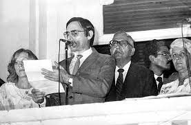 10 de maio de 1985 – Depois de 6 anos e um mês no cargo, o governador Jorge Teixeira passa o a função ao ex-deputado estadual Angelo Angelin, indicado ao presidente José Sarney (nomeante) pela “Frente Liberal”, composição de senadores, deputados federais e estaduais, acordo supostamente armado por ex-aliados e afilhados políticos de Teixeira. Angelin, indicação (imposição?) do ex-deputado federal Jerônimo Santana, foi um dos 24 cidadãos que em 1983 escreveram e assinaram a primeira Constituição de Rondônia. Angelin foi um eleitor forte de Jerônimo Santana para vencer a disputa (1985) da prefeitura de Porto Velho e a de governador em 1986. Em 1990 Angelin tentou e não foi eleito senador, e aposentou-se da política. (F. Angelin discursa, ao lado da esposa Elisabeth. Atrás Teixeira e esposa Aída; entre os dois o então deputado federal Orestes Muniz).