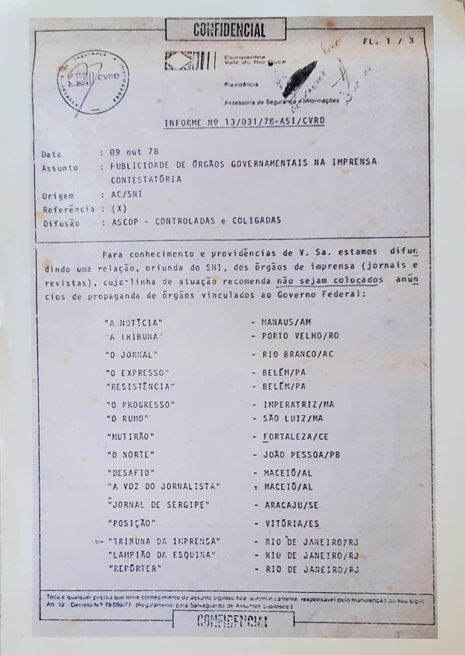 Quando eu vejo jovens jornalistas reclamarem de censura fico pensando que eles falam sem saber o que seja. Numa das últimas vezes que houve censura por aqui aconteceu no jornal A Tribuna na antevéspera da eleição a prefeito em 1985. Segundo o que circulou na época é porque o jornal iria fazer duras denúncias contra o candidato do PMDB Jerônimo Santana, e o TRE acabou empastelando a edição. No dia seguinte, véspera do pleito o TRE chamou para uma coletiva. A coisa estava risível: “Não pode publicar isso, aquilo, aquilo outro também...”. A coletiva foi encerrada logo depois de começar, quando, se não me engano, o Paulo Queiroz, perguntou ao presidente do Tribunal: “Doutor, podemos ao menos informar que amanhã é eleição?” A foto é um documento de um órgão de segurança do Governo Federal: A Tribuna (PVh), A Notícia (AM) e Rio Branco (AC) foram três onde trabalhei na época. Falta só o Estado de São Paulo, mas lá a censura começou em 1969.