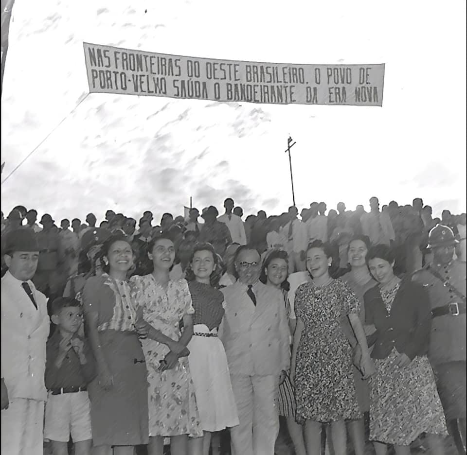 1940 - Depois de dois dias e algumas horas em Porto Velho, o presidente Getúlio Vargas se despede da cidade – cujos moradores em sua quase totalidade e muitos vindos de Guajará-Mirim – foram ao “bota fora” presidencial. Ao fundo a homenagem e o agradecimento dos habitantes exaltando o “Bandeirante da Nova Era”. Antes de entrar na canoa que o levaria ao hidroavião - aqui conhecido por “Catalina”, Vargas, que teve dias muito cheios de inaugurações, reuniões, desfiles, visitas ao pátio da EFMM e outra ao ponto onde estava iniciada a construção de uma rodovia rumo a Cuiabá e a um colono onde conheceu o ouriço da castanha, ele parou para uma foto com as jovens e senhoras, sendo a última da direita a consulesa da Bolívia em Porto Velho, conforme o historiador Esron Menezes, presente ao fato. (Acervo Lúcio Albuquerque, doado por E. Menezes).