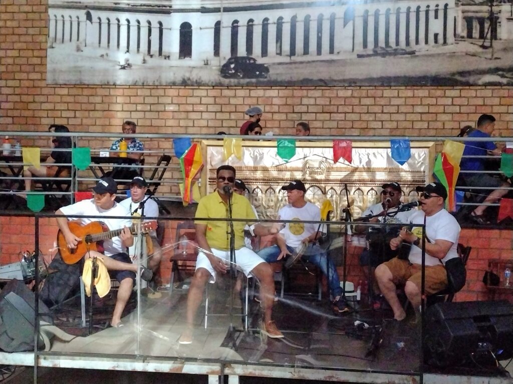 O espaço “Calçadão Manelão” do Mercado Cultural estava parcialmente lotado e o que foi mais legal, o público ficou até o fim da apresentação do nosso Poeta da Cidade – Ernesto Melo e a Fina Flor do Samba.