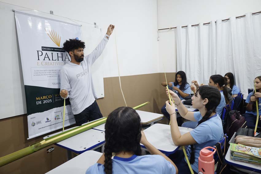 Sob a orientação do artesão Marcio Guilhermon, os alunos experimentaram a leveza da palha entre os dedos, aprenderam a respeitar o tempo do material e descobriram que o fazer artesanal carrega histórias, memórias e modos de vida. A oficina foi oferecida gratuitamente e teve como proposta unir teoria e prática em três encontros, onde os participantes criaram biojoias, cestos e esteiras, aprendendo também sobre sustentabilidade, identidade e o valor da produção manual.