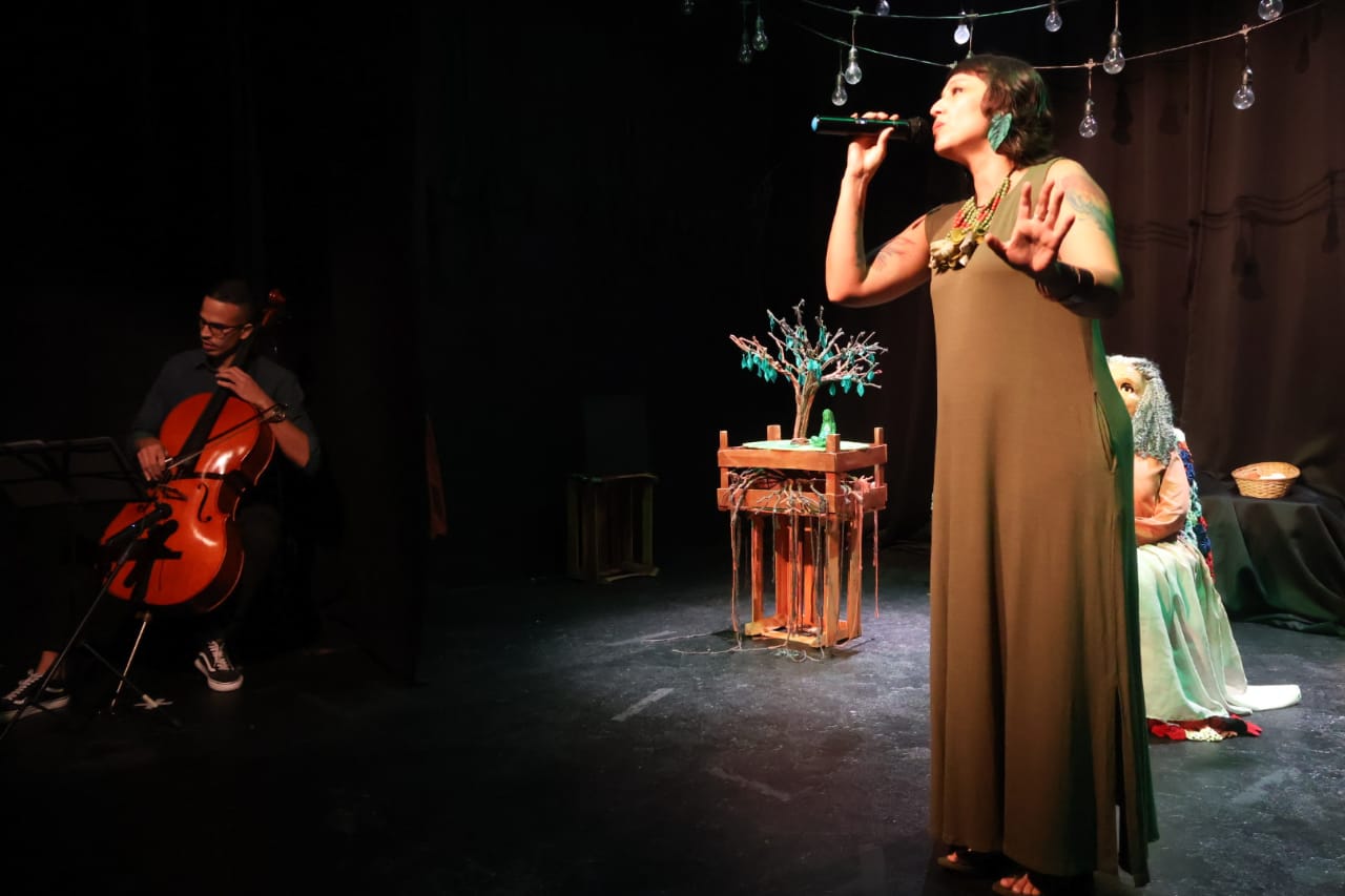 O cenário, composto por elementos artesanais — como bordados feitos à mão —, contribui para a ambientação poética e sensorial da obra, reforçando o simbolismo das histórias apresentadas.