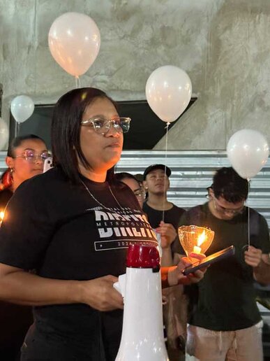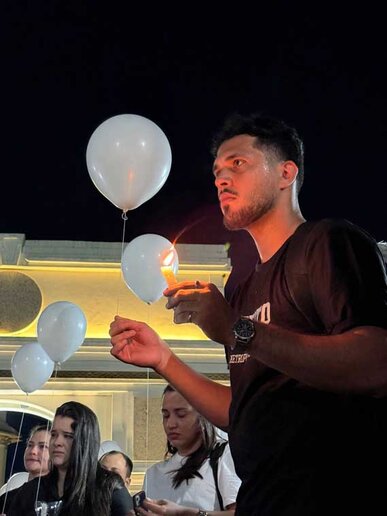 à professora. O ato foi encerrado com a soltura de balões brancos, reforçando a