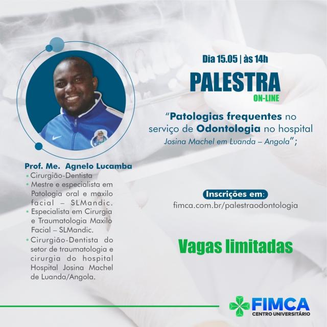 O curso de Odontologia do Centro Universitário Aparício carvalho - FIMCA, promove no próximo dia 15 deste mês uma palestra online com o Prof. Me. Agnelo Lucamba que atende no Hospital Josina Machel em Luanda na Angola. Agnelo tem casos clínicos muito raros de serem encontrados dentro da odontologia, e falará sobre eles na palestra que tem como tema "Patologias Frequentes no serviço de Odontologia no Hospital". A palestra acontecerá pelo google meet, dessa forma o aluno deve ter uma conta no gmail para poder ter acesso. As inscrições poderão ser realizadas até no máximo 1 hora antes da palestra que começará as 14h, o link será encaminhado para o e-mail de inscrição do aluno. A inscrição para assistir a palestra é gratuita e pode ser feita através do link fimca.com.br/palestraodontologia , as vagas são limitadas.