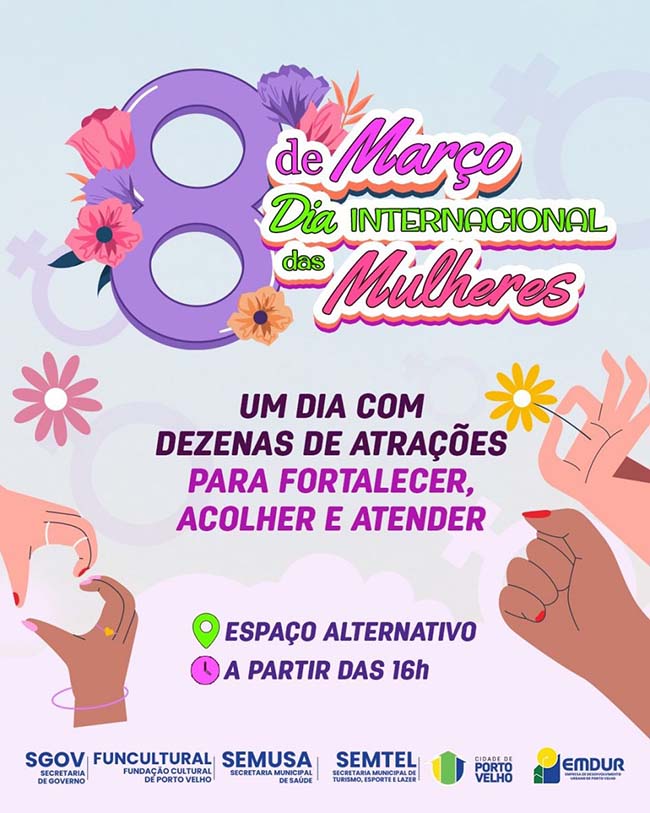 Para celebrar o Dia Internacional da Mulher, a Prefeitura de Porto Velho realiza neste domingo (08), a partir das 16h, no Espaço Alternativo, uma ação integrada comemorativa. O evento “Dia Delas” reúne serviços de saúde, atividades culturais, práticas esportivas e programação musical voltada ao público feminino.