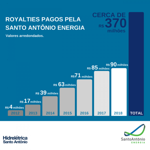 Desde que começou a gerar energia, em março de 2012, até dezembro do ano passado, a Hidrelétrica Santo Antônio já pagou cerca de R$ 370 milhões em royalties. Apenas em 2018 os royalties pagos superaram os R$ 90 milhões.