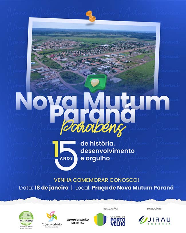 “Esta data representa mais do que um aniversário, é um marco de convivência, compromisso e esforço coletivo. Estamos felizes em ver o quanto Nova Mutum Paraná continua evoluindo, se tornando um lugar de oportunidades para as pessoas que aqui vivem”, afirma Ana Arruda, presidente da Associação das Mulheres de Nova Mutum Paraná (ASMONOMU).
