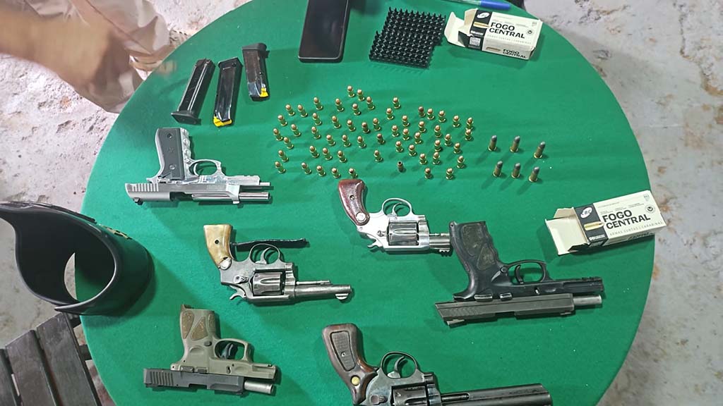 Em uma oficina de motos, indicada pelo suspeito, foi encontrada mais uma pistola calibre 9mm e um revólver calibre .38. Em seguida, os policiais foram até a residência de um homem, na localidade, identificado como A. R., onde localizaram outra pistola calibre .380, além de dois coldres, diversas munições de diferentes calibres e um carregador de alta capacidade.