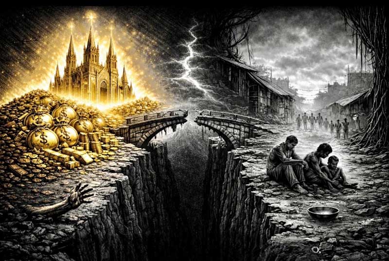 humiliates the conscience continues to grow: consecrated delirium — “holy” wars, trillion-dollar wealth, and a people left in misery.