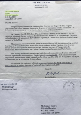 Convite para participar de conferencia na Casa Branca sobre o crescimento da população latina nos Estados Unidos.
