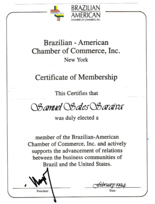 Certificado de membro da Câmara de Comércio Brasil-EUA.
