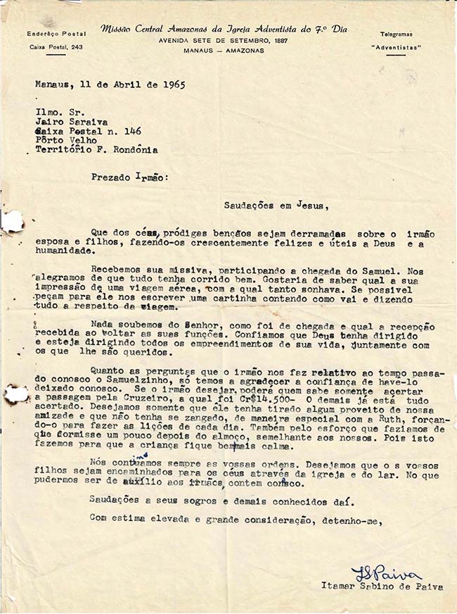 carta, enviada pela Missão Central Amazonas da Igreja Adventista do Sétimo Dia, é mais do que uma comunicação