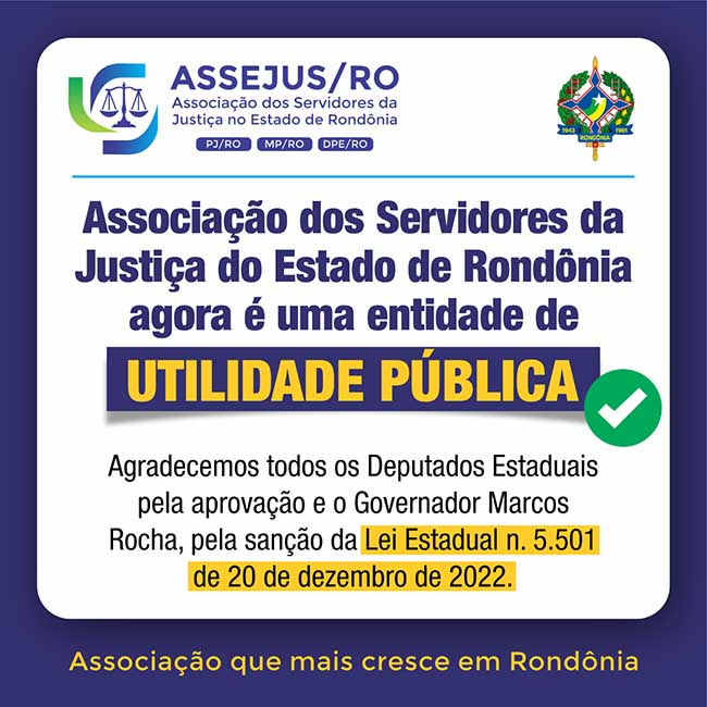 A Assejus/RO, foi reconhecida através da Lei Estadual nº. 5.501/2022, como um entidade de utilidade pública. Dessa forma, poderá receber incentivos fiscais, recursos públicos, cadastrar projetos e etc.